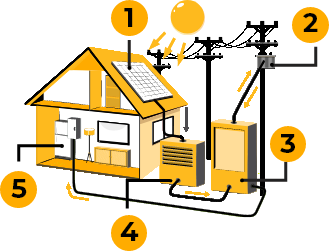 - Inwerter zmienia prąd stały na prąd zmienny i wpuszcza energię wytworzoną przez ogniwa do sieci elektrycznej budynku.